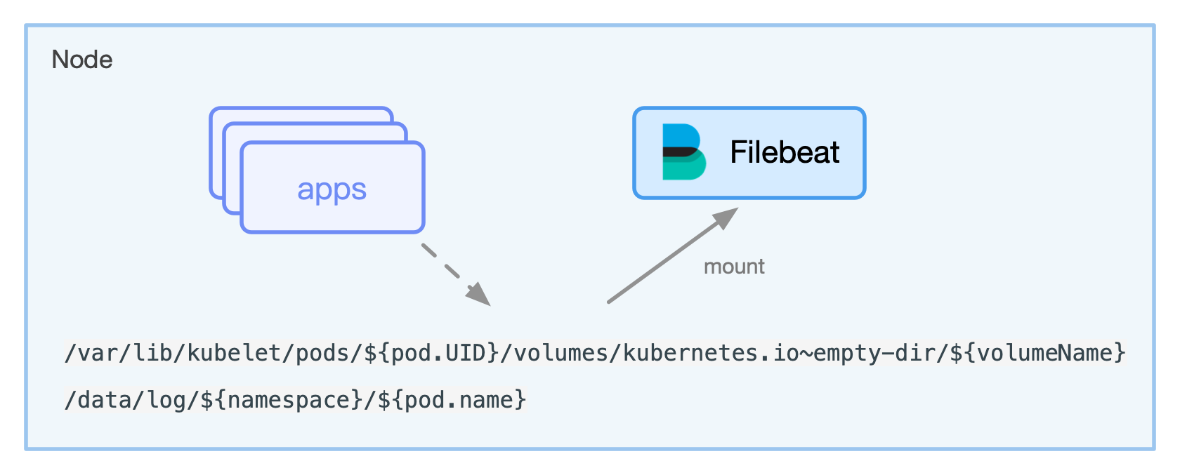 如果Pod里不仅仅是输出stdout,还包括日志文件,就需要考虑到挂载日志文件到节点上,同时采用DaemonSet部署的Agent也需要挂载相同的目录,否则采用容器化部署的Agent无法查看到相应的文件,更无法采集。